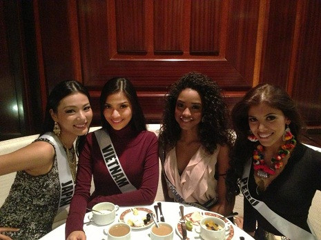 | Các hoa hậu tạo dáng vui vẻ, thân mật bên nhau khi dùng bữa. |