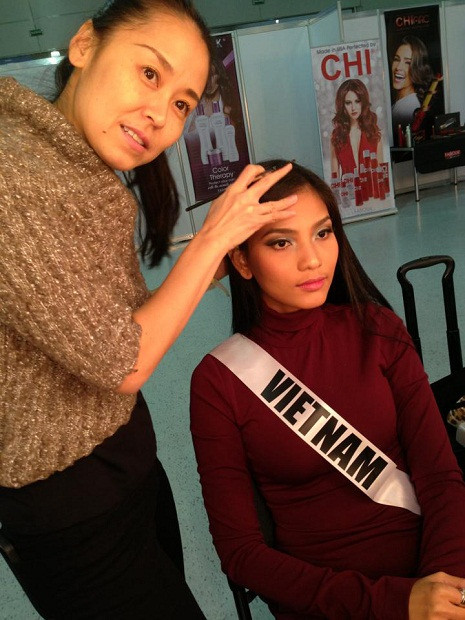| Á hậu Trương Thị May chụp hình lưu niệm cùng người quản lý của ban tổ chức trước cửa phòng./. |