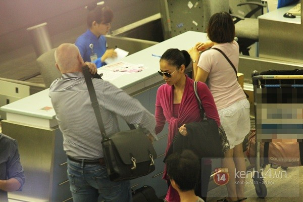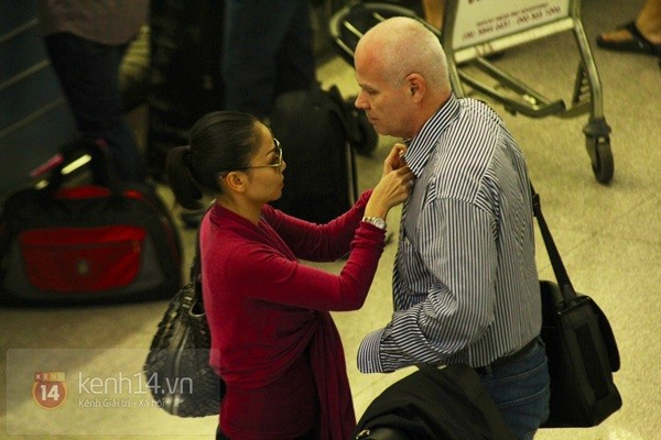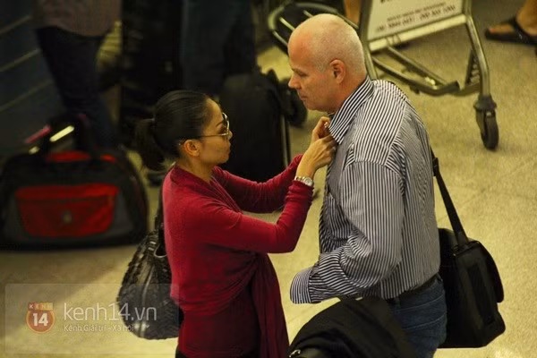 Tại sân bay, chồng Tây của Thu Minh luôn chu đáo, tận tình xách hành lý hộ vợ, trong khi đó, chị cũng rất chăm chút cho ông xã. Cả hai không ngần ngại bày tỏ tình cảm giữa nơi công cộng.