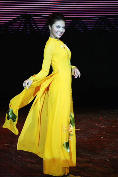 | Imiss Thăng Long 2011, Đỗ Thùy Dương thướt tha, dịu dàng song không kém phần sang trọng, tinh tế trong tà áo dài truyền thống một lần nữa khiến người xem phải trầm trồ thốt lên : "Thương lắm áo dài ơi!" |