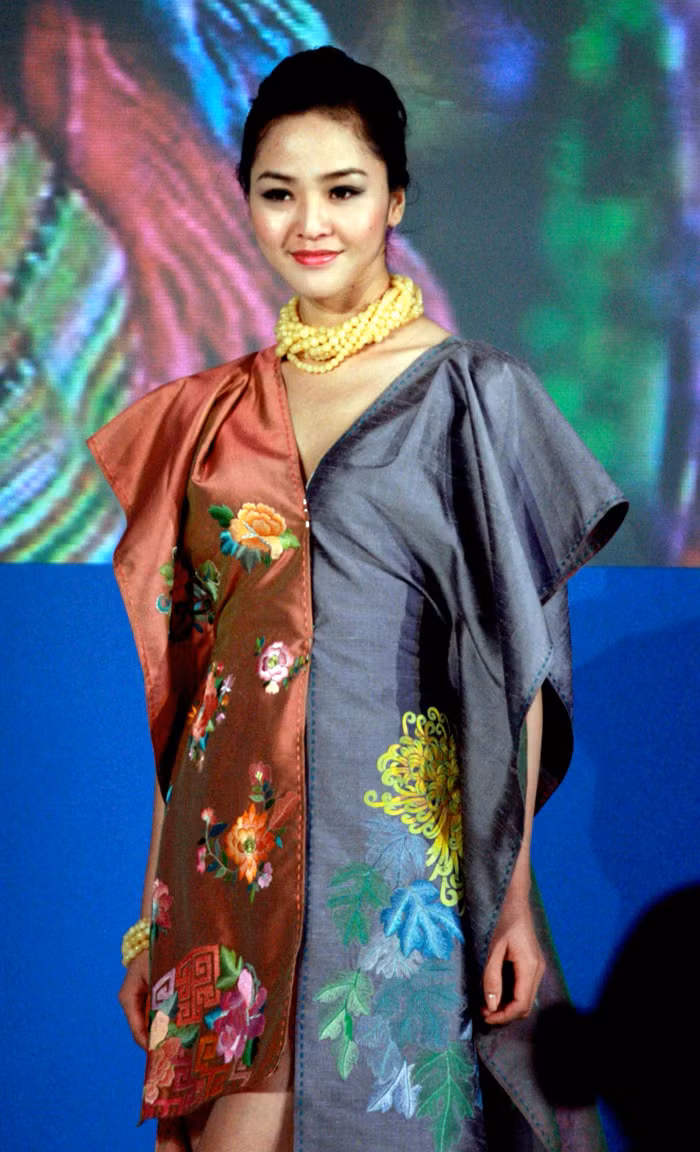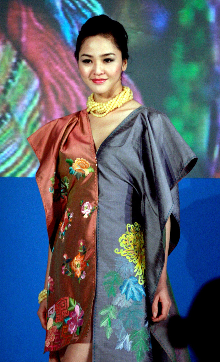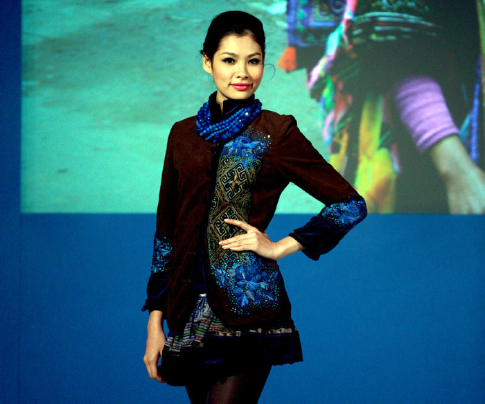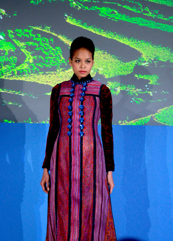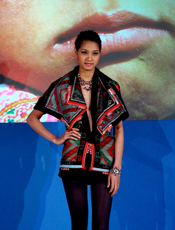 | Bộ sưu tập của Nhà thiết kế Minh Hạnh lấy chất liệu thổ cẩm làm dấu ấn chính của ý tưởng qua phần biểu diễn của Hoa hậu Ngọc Hân và Thùy Dung, cùng các người mẫu của New Talent. Trong ảnh: Hoa hậu Ngọc Hân. |