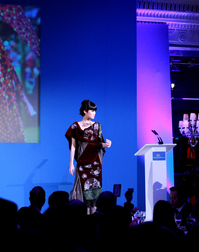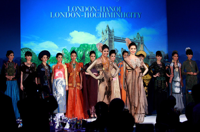 | Phần trình diễn thời trang tối 9/12 nằm trong buổi tiếp đón và chiêu đãi giới chức Anh quốc của Chủ tịch Quốc Hội VN Nguyễn Sinh Hùng tại khách sạn Dorchester cổ kính và nổi tiếng nhất London. Trong ảnh: Hoa hậu Ngọc Hân. |
