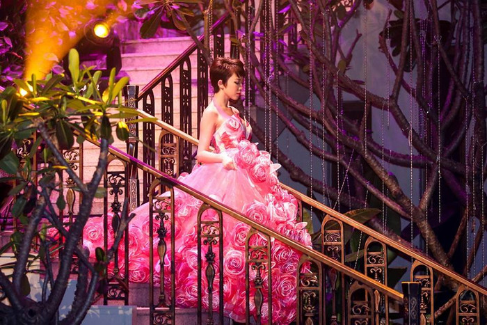 | Trái ngược với phong cách mạnh mẽ lúc vừa xuất hiện, giờ đây Tóc Tiên trong như một nàng công chúa yêu kiều với đầm hồng rực rỡ. |