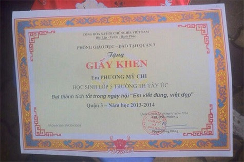 Chiều tối 19/1, nam ca sĩ hải ngoại Quang lê đã tự hào khoe trên trang cá nhân hình ảnh con gái nuôi - Phương Mỹ Chi nhận giải thưởng trong cuộc thi liên trường "Em viết đẹp - viết đúng" do Ủy ban nhân dân Quận 3, Phòng Giáo dục và Đào tạo tổ chức (TP.HCM) tổ chức.