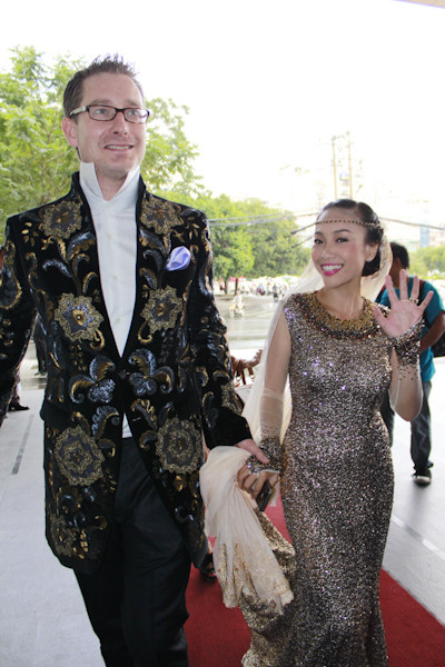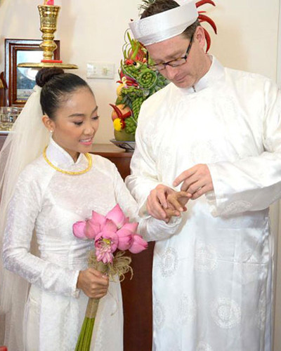 Khác với những đám cưới truyền thống, Đoan Trang mặc một bộ đầm của NTK Công Trí thay vì mặc váy cưới trắng như thường thấy. Cô rất hãnh diện và hạnh phúc khi đi cạnh "chú rể tây" 45 tuổi của mình. Trong đám cưới, Đoan Trang chỉ mời khoảng 200 khách và cực kỳ hạn chế truyền thông bởi cô "chỉ muốn dành riêng ngày trọng đại cho gia đình và người thân".