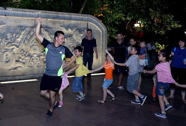 Để chuẩn bị cho hoạt động chính vào 8h sáng ngày 4/5 tại Công viên Bách Thảo (Hà Nội), Tự Long đã dành thời gian tập nhảy cùng nhiều em nhỏ của thủ đô. Anh chia sẻ, những buổi tập với các bé luôn diễn ra trong bầu không khí vui vẻ bởi tính cách hồn nhiên, ngây thơ của các em.