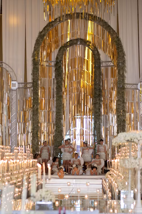 Ngay từ sân của sảnh tiệc, khu vực đón khách được trang trí bằng cổng lụa trắng mềm mại. Một cổng hoa lớn gây ấn tượng được dựng ngay trước cửa đón khách. Trong lễ cưới, có 3 cổng hoa lớn được trang trí cầu kỳ nằm ở cửa đón khách, cửa của khán phòng và trên sân khấu.