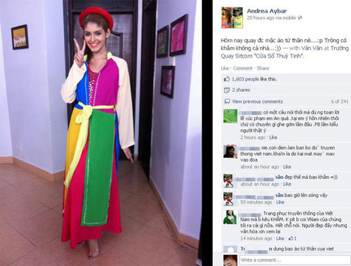 Mới đây nhất, Andrea đã đưa lên trang cá nhân của mình hình ảnh nữ tính, dịu dàng trong trang phục tứ thân. Tuy chiếc áo khiến cô rất xinh đẹp và duyên dáng, nhưng Andrea lại đưa ra một chú thích ảnh có phần nhạy cảm: "Hôm nay được mặc áo tứ thân này. Trông có khắm không cả nhà?". Những phát ngôn của cô khiến hầu hết cư dân mạng "không chấp nhận" nổi một người mẫu trẻ ăn nói "thiếu lịch sự" như vậy.