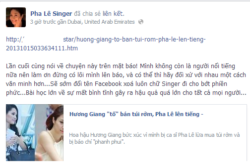 Trước đó, trên trang cá nhân của mình, Pha Lê cũng tỏ ra khá mệt mỏi vì câu chuyện bị “làm ầm” lên. Cô cho rằng cách xử lí của Hương Giang không khéo léo nên khiến cả hai bị “làm mồi ngon cho thiên hạ mổ xẻ”.
