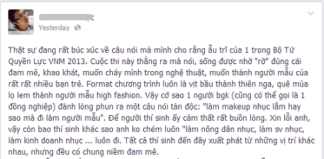 Chia sẻ quan điểm trên cương vị những người đồng nghiệp, một thành viên khác bức xúc nói: "Thưa anh! Cùng là đồng nghiệp với nhau, kẻ đi trước, người theo sau. Anh cũng make up giống như em tôi, make up là NHỤC lắm sao mà anh phải đi làm giám khảo tuyển chọn model? Anh cũng tạo dáng, làm này làm nọ để ra dáng 1 người mẫu.