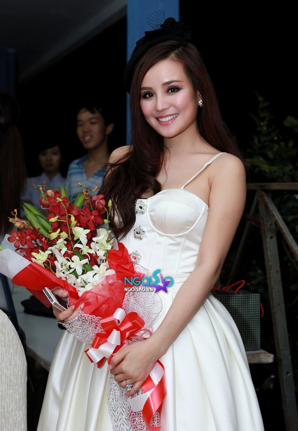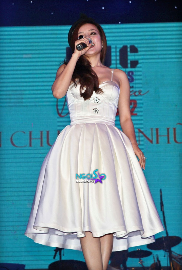 | Cô ăn mặc đơn giản nhưng lại vô cùng xinh đẹp và tinh tế khi chọn chiếc váy trắng thướt tha, kiểu tóc cũng đơn giản cùng chiếc mũ lệch trên đầu. Hình ảnh của Vy Oanh không khác gì 1 cô công chúa đi hát. |