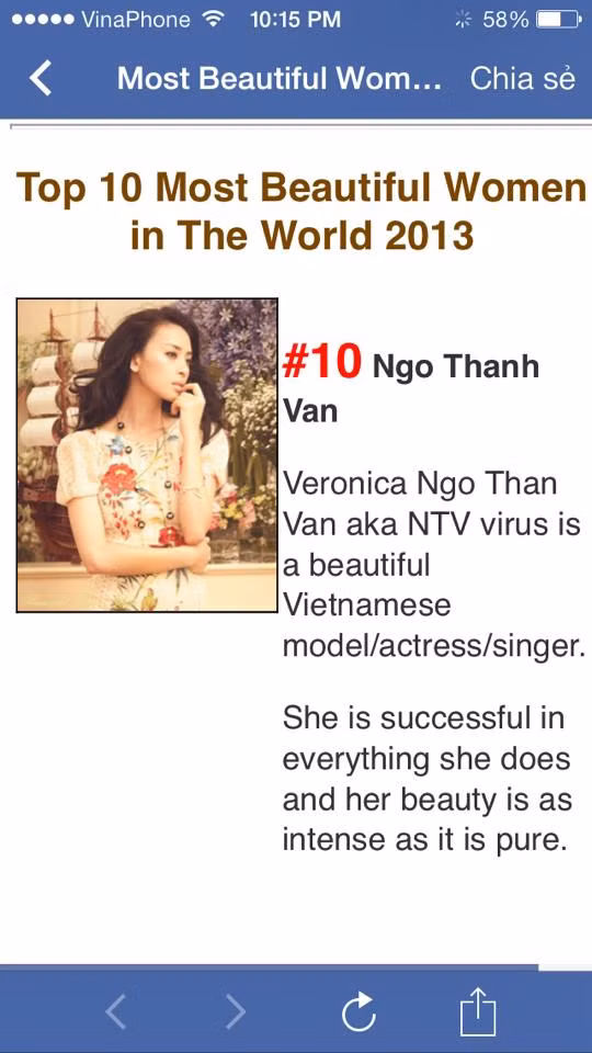 Hôm qua 10/1, trang web World Actuality công bố danh sách 50 "Người phụ nữ xinh đẹp nhất 2013". Nữ diễn viên Việt Nam Ngô Thanh Vân được vinh danh ở vị trí thứ 10.