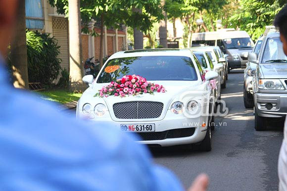 | Đúng 9h, chú rể Đức Hải lên xe hoa cùng đàn trai qua nhà cô dâu để làm lễ đón dâu. Vì khu vực báo chí được tác nghiệp khá cách xa cổng chính nhà chú rể nên để chụp cận mật là khá khó khăn. Ngay sau khi chú rể lên xe, đoàn xe rước dâu cũng di chuyển khá nhanh. |