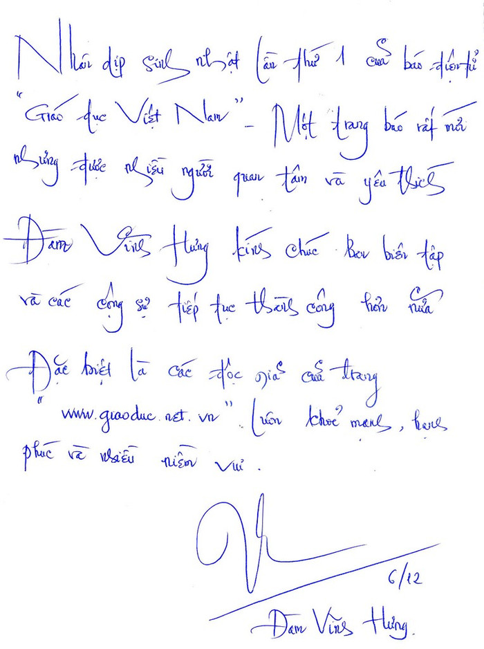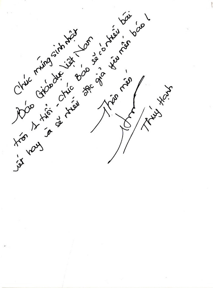 (GDVN) - BBT Giáo dục Việt Nam trân trọng đăng tải hình ảnh ca sĩ Đàm Vĩnh Hưng và MC, người mẫu Thúy Hạnh viết thiệp chúc Báo Giáo dục Việt Nam tròn 1 năm tuổi.