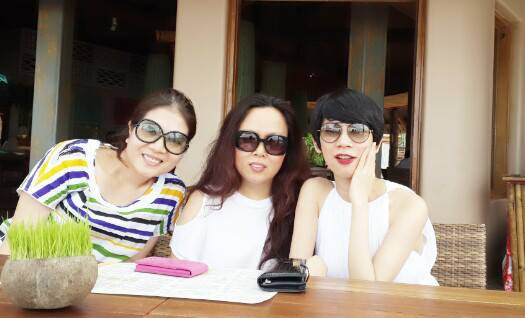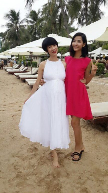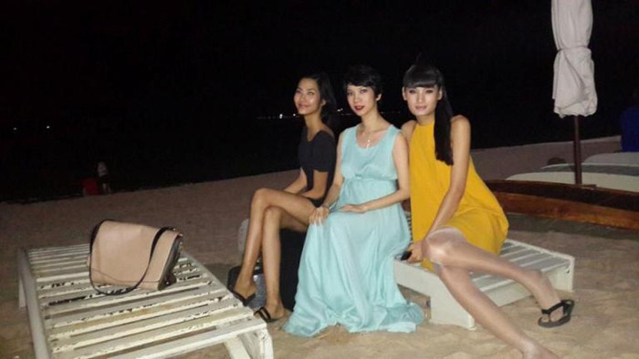 | Xuân Lan vui vẻ chụp hình cũng Hoàng Thùy và Lê Thúy trên bãi biển. |