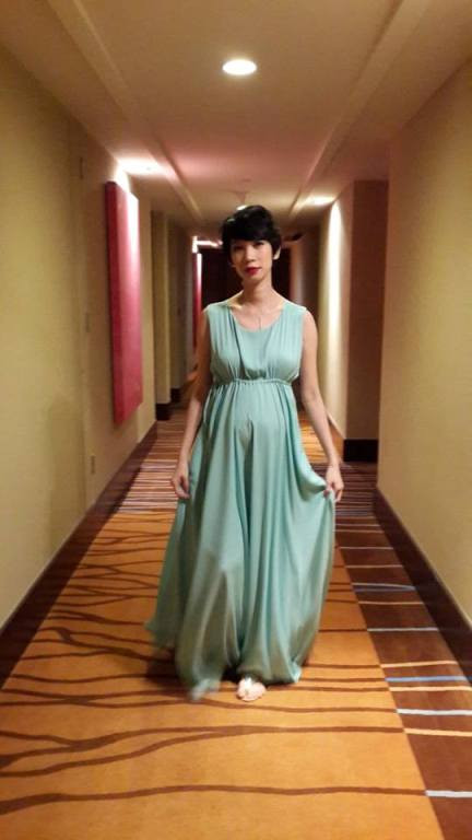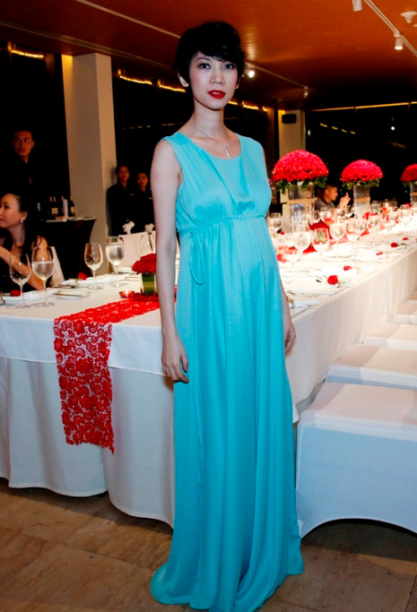 | Xuân Lan chọn cho mình chiếc đầm xanh nhẹ nhàng. |