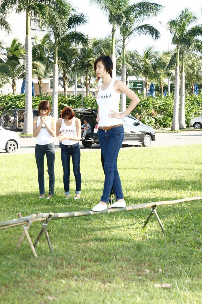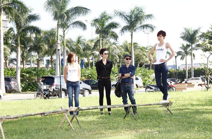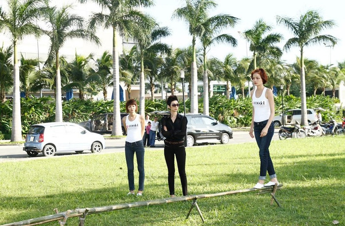 | Thanh Thủy, Lê Thị Thúy, Hoàng Thị Thùy, Lê Thị Phương, Nguyễn Thị Tuyết, Phương Anh đều gặp trở ngại trong việc giữ thăng bằng, những cô nàng-thành-thị này gặp phải rất nhiều khó khăn. Đây là bài tập nâng cao của kĩ năng catwalk, giữ thăng bằng và tập làm quen trên mọi địa hình catwalk khác nhau. |
