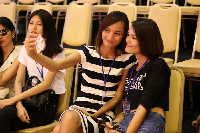 | Các người mẫu vui vẻ tạo dáng chụp ảnh trong giờ nghỉ giải lao. |