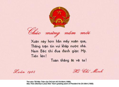 Xuân Mậu Thân 1968, Bác viết: Xuân này hơn hẳn mấy xuân qua,Thắng trận tin vui khắp nước nhà, Nam Bắc thi đua đánh giặc Mỹ. Tiến lên! Toàn thắng ắt về ta!