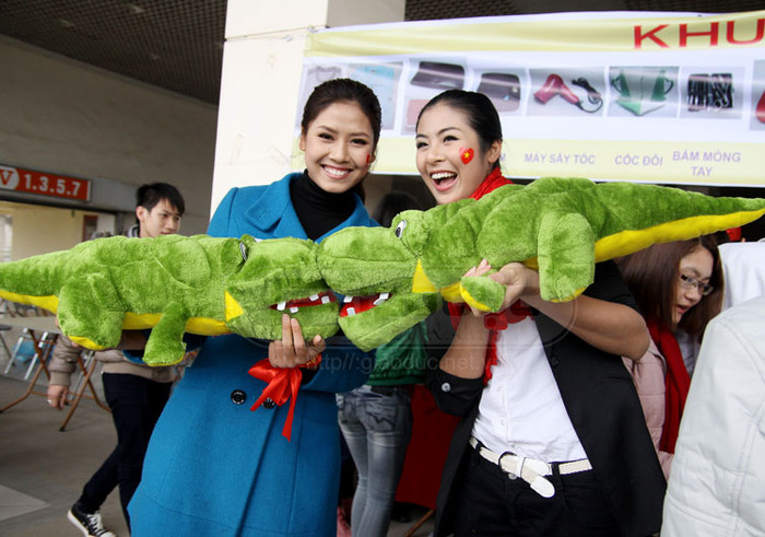 | Ngọc Hân và "người tình" Nguyễn Thị Loan đã chọn cho mình hai con cá sấu nhồi bông. |
