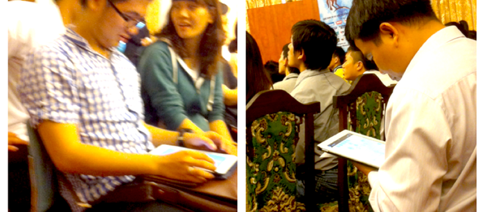 Có những bạn không phát biểu thì nghe và... chơi cờ tướng, lướt Facebook (trên iPad) rồi tụm lại chỉ trỏ, cười nho nhỏ; đến lúc nghe giáo sư người Nhật kể câu chuyện "hồi nhỏ tôi có nuôi 10 con gà" thể hiện ý chí tự lo lương thực của mỗi người dân không trông chờ vào chính phủ thì ngẩng mặt lên... cười thích thú.