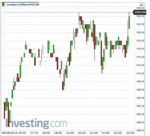 Một tin vui mới đây người trồng cà phê nhận được là mức giá cà phê trên sàn giao dịch tại London đang có xu hướng tăng. Tại sàn NYSE Liffe London, giá cà phê Robusta tiếp tục gia tăng. Kỳ hạn giao tháng 9 tăng 22 USD, tương đương tăng 1,14 %, lên 1.924 USD/tấn và kỳ hạn giao tháng 11 tăng 13 USD, tương đương tăng 0,68 %, lên 1.908 USD/tấn, các mức tăng đáng kể.
