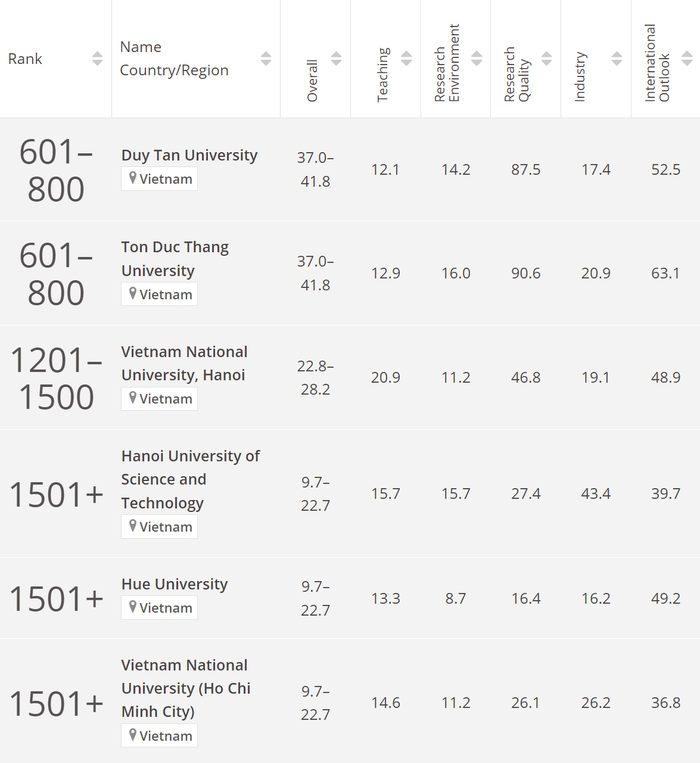 Theo kết quả được công bố, Trường Đại học Duy Tân và Trường Đại học Tôn Đức Thắng tiếp tục dẫn đầu trong các cơ sở giáo dục đại học của Việt Nam - cùng nằm trong nhóm 601-800 (tuy nhiên tụt hạng so với vị trí 401-500 của năm 2023).