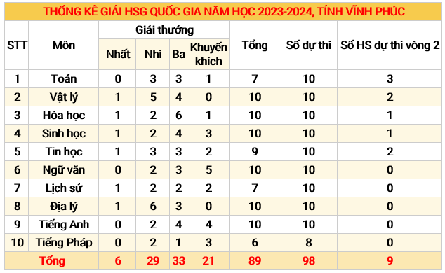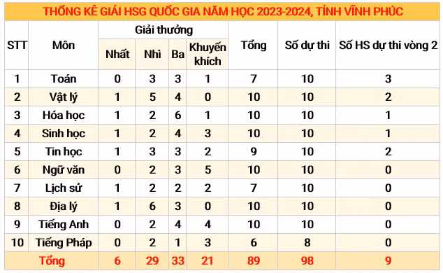 Căn cứ theo kết quả kỳ thi chọn học sinh giỏi quốc gia năm học 2023-2024 do Bộ Giáo dục và Đào tạo đã công bố, Vĩnh Phúc tiếp tục lọt top 10 đơn vị dẫn đầu cả nước về số lượng giải thưởng và cả số giải Nhất.