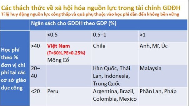 Ngoài ra, đại diện World Bank cũng chỉ ra các thách thức về xã hội hóa nguồn lực trong tài chính giáo dục đại học ở Việt Nam đó là tỷ lệ huy động nguồn lực công thấp và quá phụ thuộc vào học phí dẫn đến không bền vững.