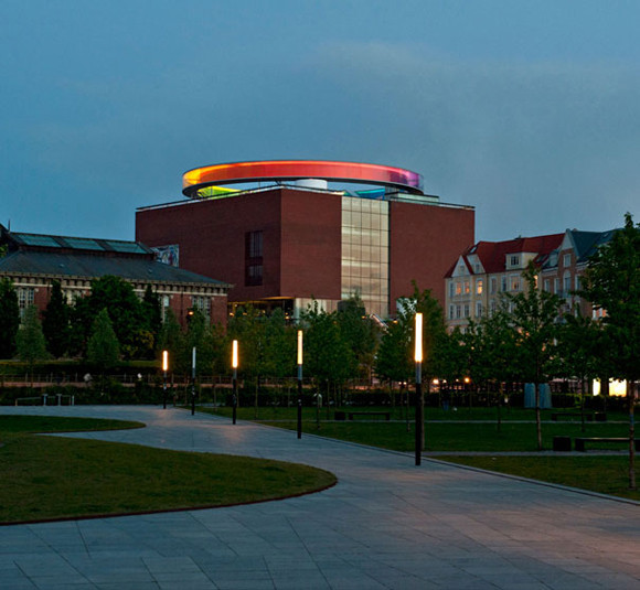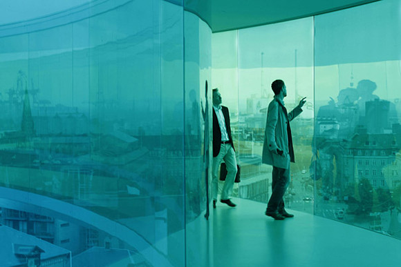 | on đường toàn cảnh cầu vồng do nghệ sĩ người Ai-len là Olafur Eliasson thiết kế. Đây là con đường dành cho người đi bộ với những tấm kính ốp đủ màu bao trọn 360 độ công trình. |