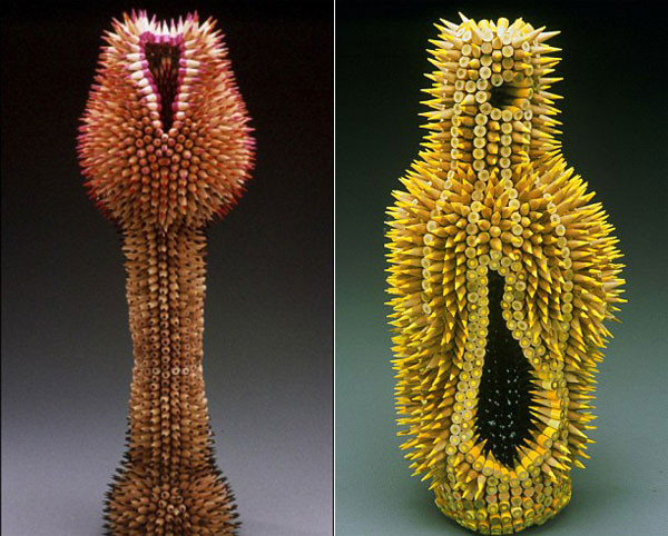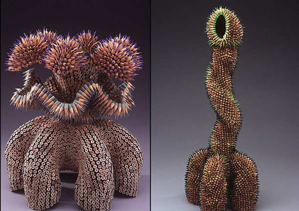 | Các tác phẩm được ghép với nhau hoàn toàn chỉ bằng bút chì bởi kĩ thuật “ghép xương rồng” (peyote stitch). |
