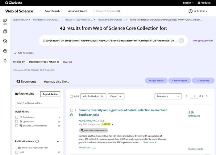 Dữ liệu được truy xuất từ Cơ sở dữ liệu Web of Science (WoS, Mỹ) vào ngày 23/09/2025, bằng thuật toán nâng cao với Query Builder kết hợp cùng lúc các miền dữ liệu SO, CU, DT và DOP đồng bộ. Dữ liệu thu được cho thấy cả thế giới đã công bố được 1.049.516 bài báo nghiên cứu loại WoS thuộc hai nhóm chính SCIE và SSCI, không kể nhóm dự bị ESCI. Trong đó, tổng số bài báo nghiên cứu trên hai tạp chí Nature và Science là 1.102, chiếm khoản 0,1% tổng số bài SCIE và SSCI. Và số bài báo nghiên cứu trên hai tạp chí lừng danh này của các nước ASEAN là 42, chiếm 3,81% toàn thế giới.
